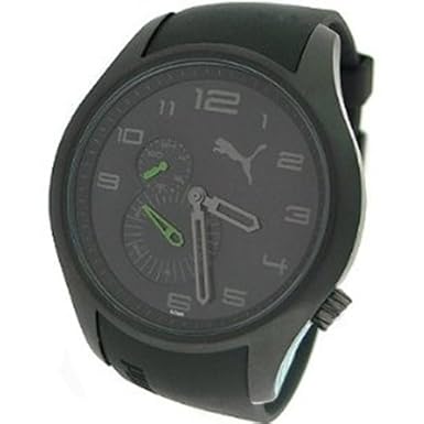 This large sized PUMA men's watch, model #PU102351003, has a round black dial and metal case with a diameter of 46mm. It features an attractive buckle; black polyurethane bracelet with a length of 22 cm. This quartz movement analog time piece is backed with a 2 year warranty and is water resistant up to 50 meters.